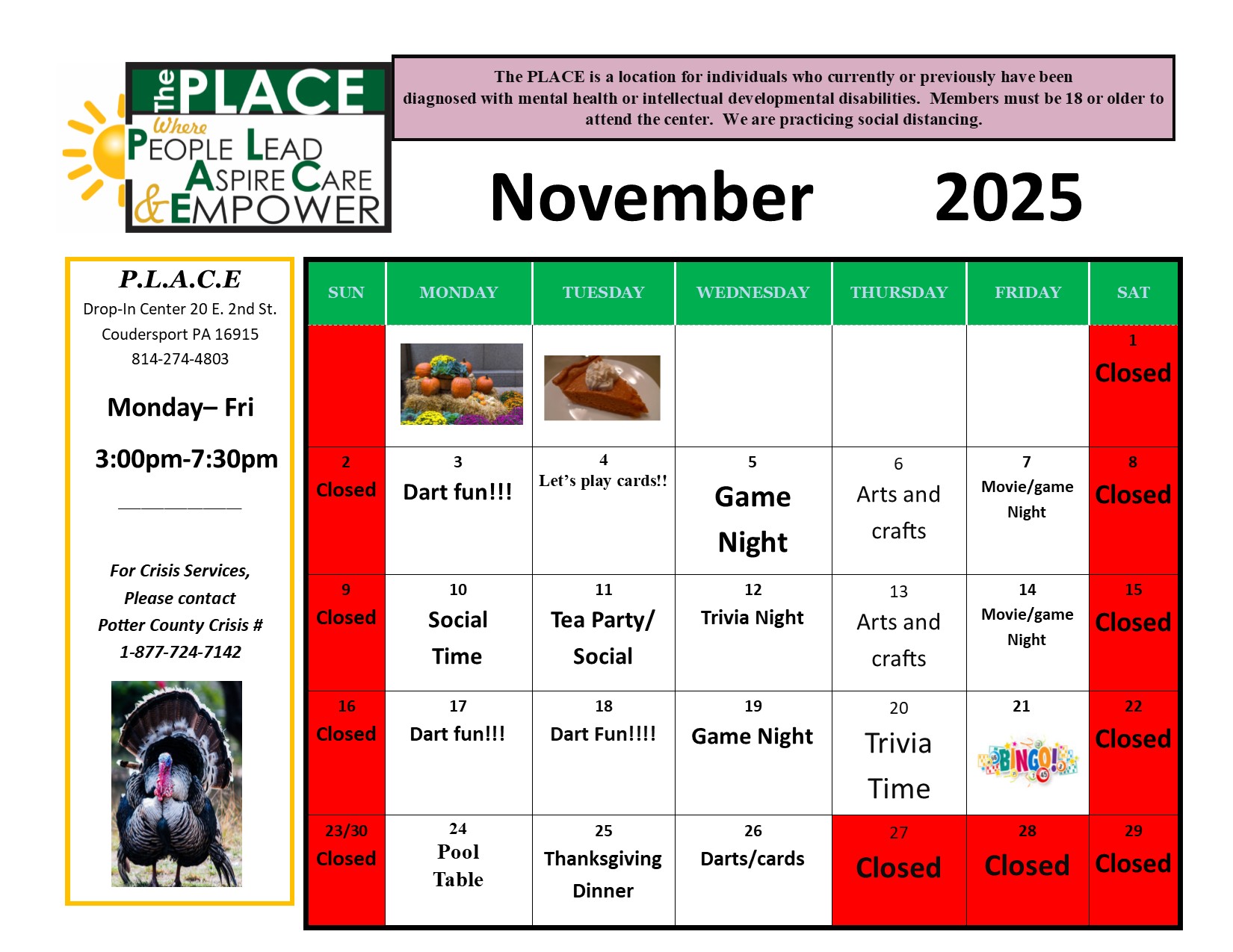 The Place Drop-In-Center is located in Coudersport, PA. The center includes a TV, DVD player, a library, living room, kitchen, computer, and craft area. Monthly activities are suggested by the consumers. Example activities throughout the month include: cinch tournaments, dinners, X-Box, crafts, coffee club, and bingo.